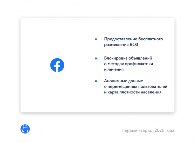 усилил меры контроля за рекламой, связанной с коронавирусом. Соцсеть блокирует рекламу, если в ней упоминаются методы профилактики и лечения коронавируса или рекламодатель пытается создать ощущение срочности ради извлечения коммерческой выгоды. Всемирная организация здравоохранения и другие вовлеченные организации могут бесплатно показывать объявления для повышения осведомленности о заболевании. Кроме того, соцсеть предоставляет анонимные данные о перемещениях пользователей и карту плотности населения, чтобы организациям было проще понять, как распространяется вирус.