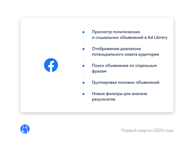 смогут управлять количеством политической и социальной рекламой, которая им показывается. Первые такую возможность получат жители США — летом 2020 года. Также в библиотеке рекламных объявлений (Ad Library) пользователи смогут увидеть все объявления на политические или социальные темы и уточнить их потенциальный охват аудитории. А в поиске Ad Library станет возможно искать рекламу по отдельным фразам, группировать похожие объявления и применять новые фильтры: размер аудитории, даты и регион рекламной кампании и т. д.
