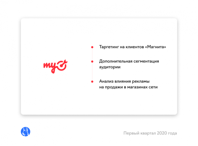 объявили о партнерстве. Рекламодатели myTarget получили возможность таргетировать рекламу на клиентов магазинов «Магнит». Аудиторию можно дополнительно сегментировать по узким характеристикам: особенностям покупательского поведения и предпочтениям, в том числе по покупкам отдельных категорий товаров и брендов, форматам посещаемых магазинов и т. д. Также можно отслеживать изменение спроса на товар в зависимости от настроек таргетинга и креативов. Благодаря атрибуции рекламы с программой лояльности «Магнита» бренды получили возможность проанализировать влияние рекламы на продажи в магазинах сети, измерить ROI и повысить эффективность интернет-продвижения.