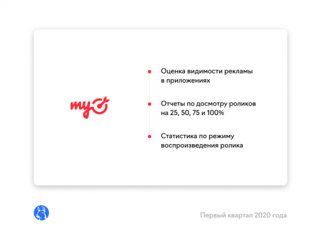 станет доступна платформа для измерения видимости рекламы в приложениях. Она позволит оценить, соответствует ли видимость рекламы в приложениях международным стандартам: на экране должно отображаться не менее 50% креатива в течение одной секунды для баннера и двух секунд — для видеообъявления. Также рекламодатели смогут просматривать отчеты по досмотру роликов на 25%, 50%, 75% и 100%, режиму воспроизведения ролика (со звуком или без) и другим показателям.