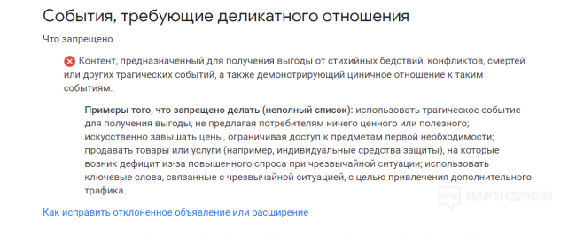 Если кратко, Google не разрешает использовать рекламные материалы, связанные с коронавирусом. В этом компания следует своему правилу о событиях, требующих деликатного отношения. Это правило запрещает любой контент, предполагающий получение выгоды от упоминаний природных катастроф, конфликтов и других трагических событий. Пандемия коронавируса явно попадает в этот список.