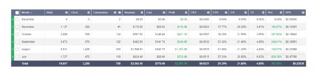 CPC рейт в статистике платформы Galaksion (выше) измеряется в центах. По статистике трекера Voluum, за время работы кампаний рекламодатель получил 700 конверсий, а доход составил $3 565. Чистая прибыль рекламодателя — $2 785, ROI — 357%.