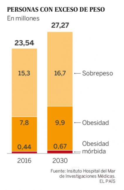 Между тем, Испания является второй страной в ЕС с самым высоким уровнем ожирения среди взрослого населения, уступая лишь Соединенному Королевству. Неутешительный прогноз Европейского регионального бюро Всемирной Организации Здравоохранения (ЕРБ ВОЗ) гласит: ожидается, что к 2030 году 27 миллионов взрослых испанцев (80% мужчин и 55% женщин) будут иметь ожирение или избыточный вес. Тогда как ещё в начале 2019 года ожирением страдали уже 25 млн всего населения Испании — фактически это каждый второй человек.