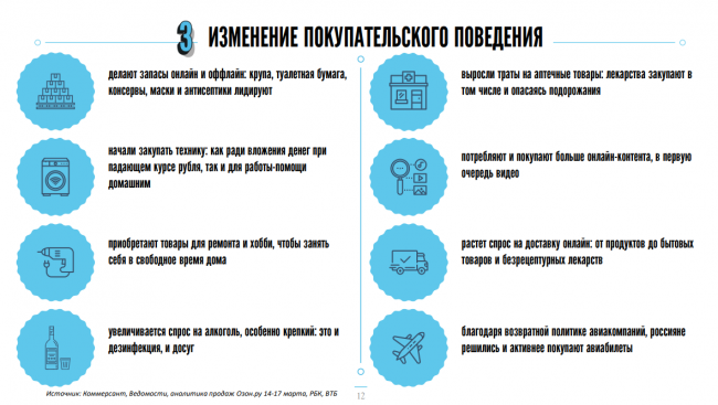 Обзор от 27 марта содержит информацию о том, как ситуация развивается в мире и в России, что происходит с товарами массового потребления и прогноз. Глобальные тренды: закупка впрок продуктами питания, покупки онлайн, рост спроса на персональные средства гигиены и падение туристической и транспортной отраслей, авиаперевозок.
