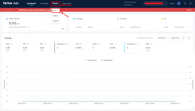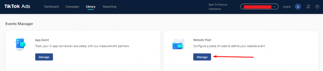 Для создания пикселя в рекламном кабинете TikTok потребуется в верхней части меню кликнуть на Library («Библиотека») — Event («События»).