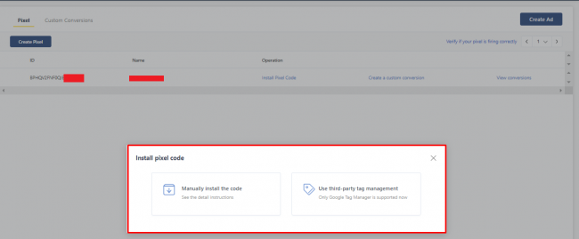 Получаем нужный код, кликнув на Install Pixel Code, выбираем ручную установку и копируем код.