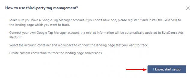При выборе Google Tag Manager (если он установлен) потребуется ознакомиться с правилами установки и нажать на кнопку I know, start setup.