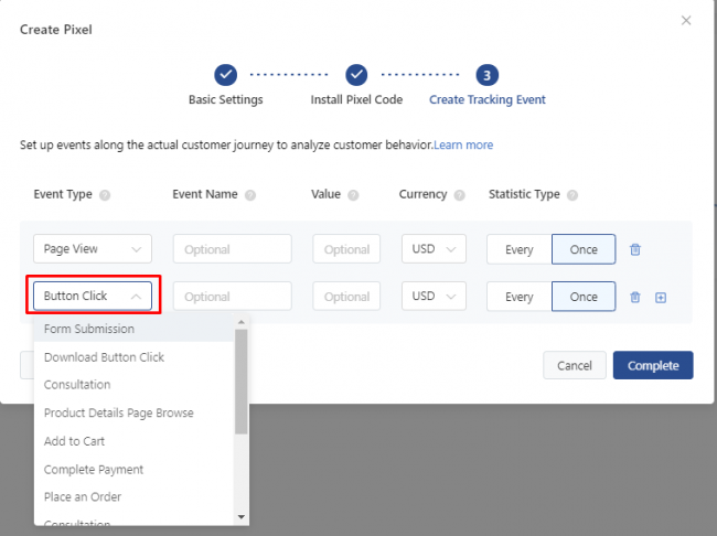 Рекомендую выбрать Custom Event: это позволит создавать любой вид конверсий, где можно при помощи простого конструктора использовать следующие типы целей: