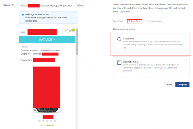 - Использовать нижний уровень конверсии. Например, есть страница товара с кнопкой «Купить в один клик», после нажатия на которую открывается форма, которую надо заполнить и отправить. В этой ситуации рекомендуется использовать именно клик по элементу (кнопке).