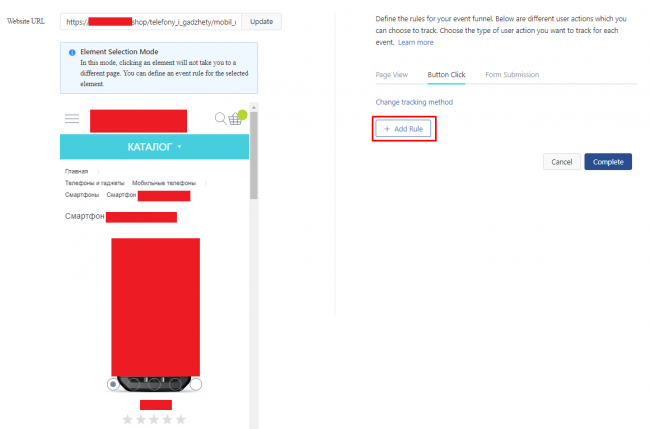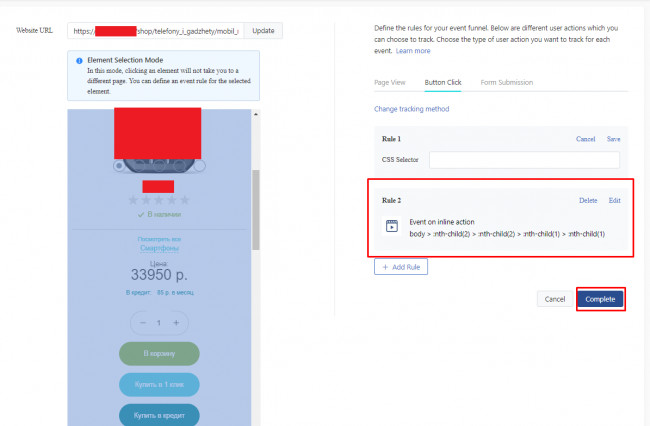 Далее выбираем элемент, по которому нужно кликнуть пользователю, чтобы цель считалась достигнутой. После этого система самостоятельно создаст правило, а специалисту не нужно будет проверять код и находить нужный CSS-селектор.
