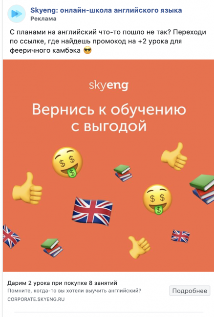 Например, онлайн-школа английского языка Skyeng с целью активизации своих старых учеников, которые прервали обучение, запустила акцию с предложением вернуться и получить два бесплатных урока. Почему это хорошее предложение: во-первых, поскольку уроки бесплатные легче принять решение, а во-вторых, на одном уроке есть большая вероятность неправильного впечатления, после двух уже легче сформировать верное отношение к продукту и понять, подходит ли обучение.