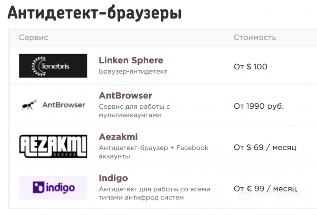 Linken Sphere, AntBrowser, Aezakmi и Indigo (он же "multilogin").