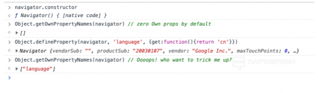 Разработчик пытался исправить ситуацию, и подменял не свойства самого объекта navigator, а свойства у прототипа его конструктора navigator.constructor.prototype. И это бы сработало, если бы их геттеры не содержали десятки килобайт обфусцированного кода, который доступен каждому сайту/антифроду.