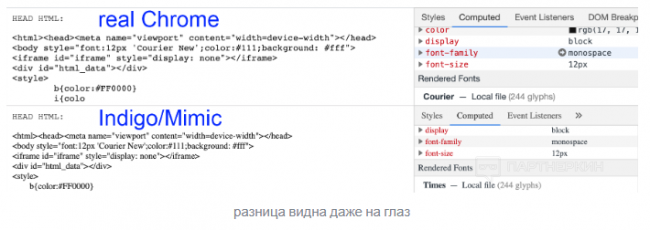 Несоответствие шрифта сайт может определить отрисовав его на канвасе, и померив, совпадает ли ширина символа ' и w, например. Разницу вы можете заметить сами на скриншоте выше. В случае с Indigo любой сайт (и антифрод) может увидеть, что используется фальшивый шрифт, а не родной системный.