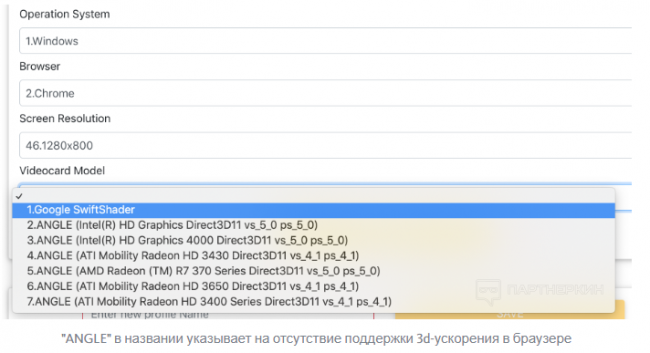 На старте при создании профиля разработчики пытаются удержать нас от возможности слить реальные webGL-отпечатки, разрешая только создание профиля с отключенной поддержкой 3d-ускорения: