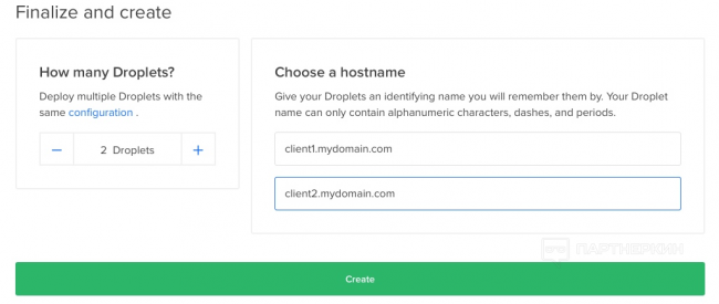 Выберите имя вашего поддомена и количество droplet, которые вы хотите создать. Далее нажмите «Create».