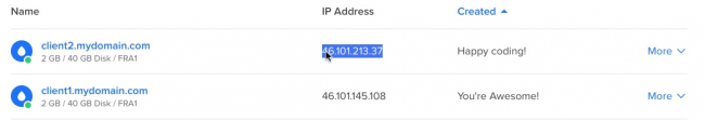 После того, как Digital Ocean завершит свою работу, он покажет IP-адреса ваших droplet.