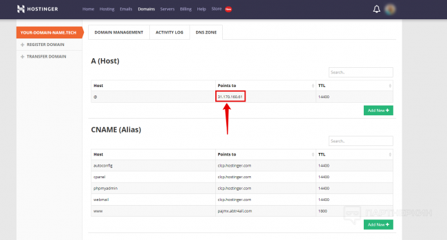 Вам необходимо скопировать данный IP-адрес для последующей настройки. Переходим на сторону хостинга в раздел DNS Zone и вставляем IP-адрес.
