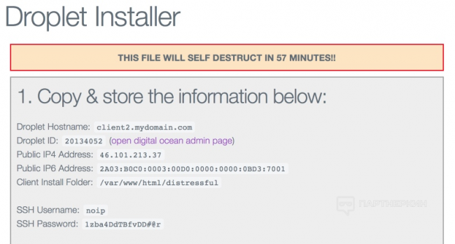 Как только droplet полностью настроен, вы должны увидеть окно как на скрине ниже. В первом разделе этого экрана перечислены важные детали. Данная страница будет автоматически удалена через 1 час.