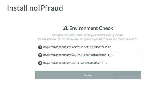 NoIPFraud в первую очередь проверит вашу серверную среду, чтобы убедиться, что установлены важные расширения. Если что-то не так, вы увидите ошибку: