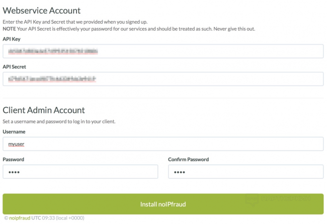 Здесь необходимо ввести ваш API key и API secret вашей учетной записи NoIPFraud и выбрать имя пользователя и пароль. Далее жмем «Install NoIPFraud».