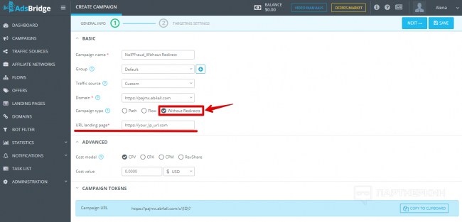Шаг 1. Создайте кампанию. Тип кампании — «без редиректа».