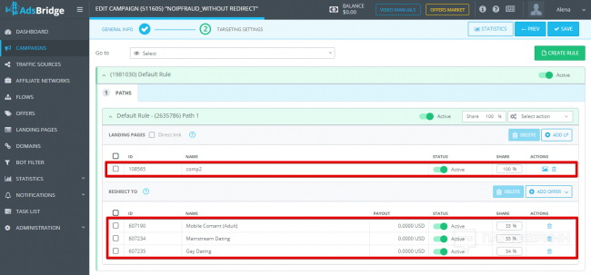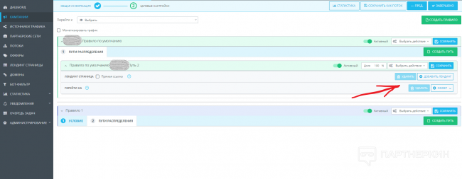 Далее, в «Правилах по умолчанию» в путях распределения выставляем нужные нам лендинг/офферы. Тех же самых модераторов отправляем на одну посадочную страницу (белую), а всех остальных пользователей на нужную нам.