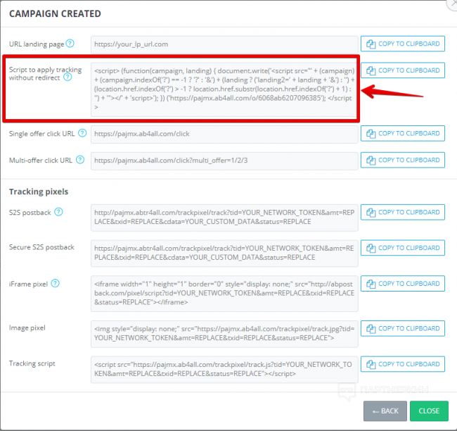 Шаг 2. Скопируйте скрипт без редиректа с попапа и добавьте его в код вашей лендинг страницы, также установите Click url на кнопки.