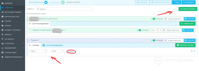 4. Далее заходим в свою кампанию в трекере, урл которого уже благополучно апрувнули в трафик-сорсе и создаем правило (как указано на скрине ниже), выбираем в разделе «Правило 1», «IP адрес», далее «равен» и вставляем скопированные нами ранее ip-адреса в табличку, нажимаем «Сохранить».