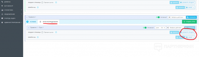 5. После, переходим во второй раздел «Пути распределения» и выбираем ту посадочную страницу (лендинг/оффер), на которой уже была пройдена модерация в нашей сетке.