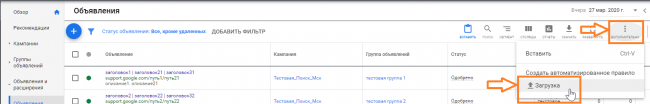 В нее можно добавить новые строки и загрузить обратно. Чтобы добавить ключевое слово, объявление или любой другой объект, создайте строку в скачанной таблице.