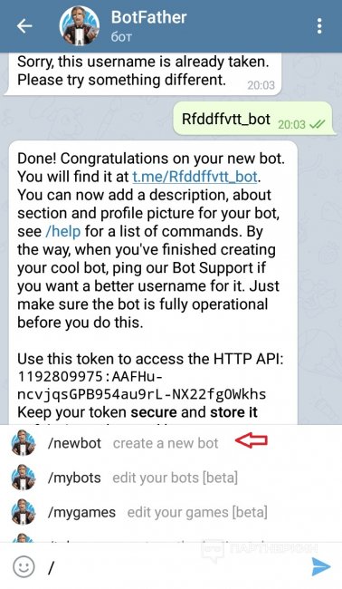 Заходим в BotFather и выбираем команду /newbot. Нужно присвоить боту имя, которое обязательно будет на латинице и в конце должно содержать слово "bot". Далее бот нам выдаст API токен, который мы копируем.