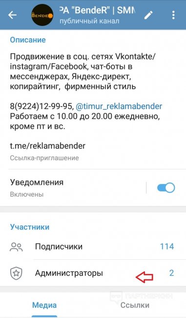 Далее добавляем нового бота в администраторы нашего канала телеграм, в котором хотим выкладывать отложенные посты. Заходим в описание канала и выбираем "администраторы" - "добавить администратора".