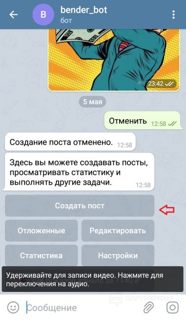 Теперь мы заходим на нашего созданного бота и можем готовить новые публикации на канал, в который мы добавили админом бота. Нужно выбрать "создать пост", далее готовим текст, также там можно добавить графику смайлы и выбрать время публикации.