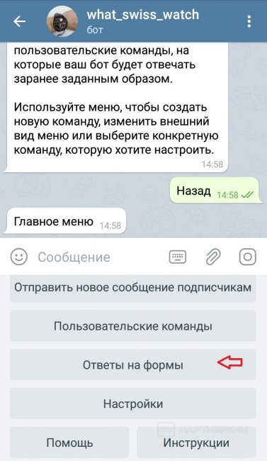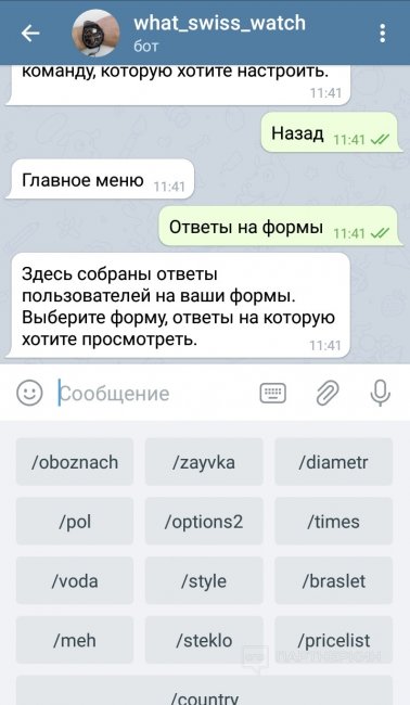 В моем боте в основном формы с ответами, чтобы посмотреть их, нужно выбрать в главном меню "ответы на формы".