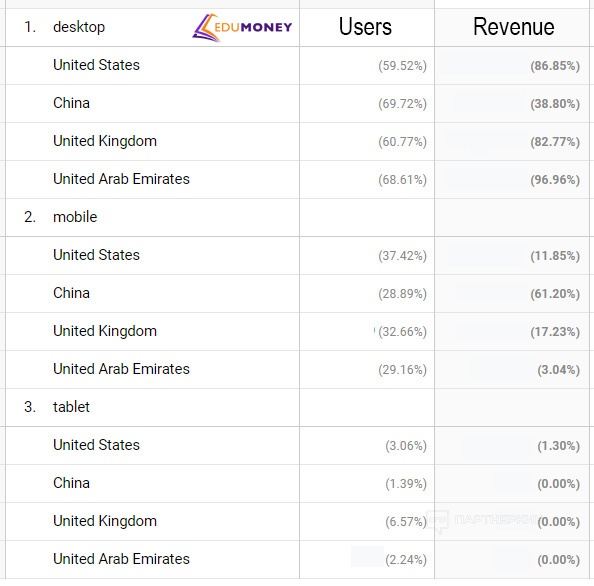 Статистика по девайсам клиентов между США, Китаем, Британией и ОАЭ.