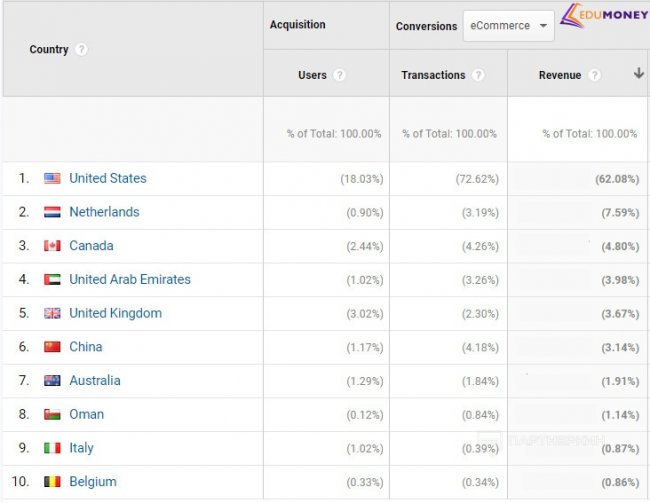 Самой прибыльной страной остаются Штаты. Они составили 62,08% всех продаж за год. На втором месте Нидерланды, на девятом и десятом - Италия и Бельгия, которые считаются нетипичными случаями, ведь английский язык не является основным в данных странах, но несмотря на это прибыль составляет 7.59%, 0.87% и 0.86%. Нидерланды это пример успешного кейса со своими особенностями, больше всего прибыли принесли клиенты в возрасте 25-34 года. Студенты данного направления обучаются на англоязычных проектах или переводят английские работы на родной язык. Канада, Великобритания и Австралия занимают соответственно третье, пятое и седьмое места, считаясь классическими направлениями для ниши. Канада принесла 4.8% прибыли, Великобритания 3.67% и Австралия 1.91%. И это не удивительно, ведь в данных странах английский язык родной и образование во всех учебных заведениях осуществляется на английском. Также, это всемирно популярные направления, после США, для получения качественного образования. Страны ближнего Востока, такие как ОАЭ и Оман, в короткие сроки смогли войти в десятку самых прибыльных страх из-за стремительного развития инфраструктуры и в частности образования. Прибыль из ОАЭ составляет 3.98%, что делает это ГЕО одним из самых перспективных, а прибыль с Омана - 1.14%.