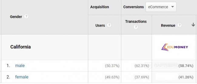 Посещают сайт в равном количестве как женщины, так и мужчины, но мужская аудитория из Калифорнии тратит на 10% больше, чем женская: