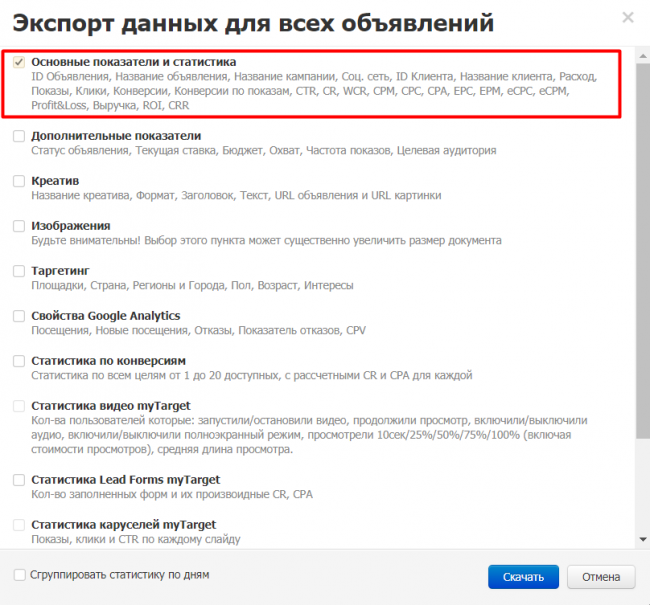 Если вы не используете их и у вас большое количество кампаний, то, к сожалению, отчет в разбивке по группам объявлений и объявлениям построить будет очень сложно. «ВКонтакте» и myTarget не позволяют делать выгрузки одновременно в разбивке по кампаниям, группам объявлений и объявлениям. Понадобится выгружать статистику по объявлениям из каждой группы вручную.