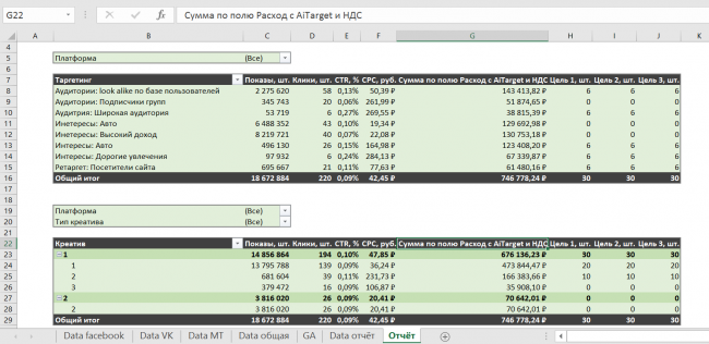 Учитывайте, что данные по расходам из кабинетов нужно привести к единому виду. Facebook, myTarget по умолчанию не учитывают НДС. Если у вас есть дополнительные агентские комиссии, то их все можно посчитать, чтобы отчет содержал конечные для клиента суммы расхода.