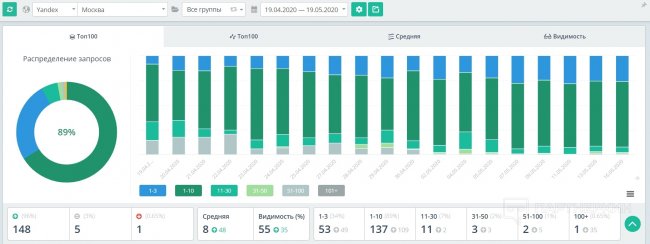Позиции и трафик на сайте продолжают расти: 89% ключей зашли в топ-10 Яндекса. Из них 34%: в топ-3.