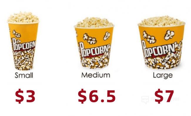 Предположим, вы в кинотеатре покупаете попкорн. Если вы выбираете между маленькой и большой порцией, вы скорей всего купите маленькую: она дешевая и попкорна в ней столько, сколько нужно. Но хитрые маркетологи добавили третий вариант – среднюю порцию! Она стоит почти столько же, сколько большая, но попкорна в ней гораздо меньше. Теперь большое ведерко с попкорном кажется самым привлекательным вариантом, даже по сравнению с маленькой порцией.