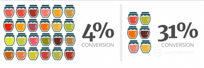 Этот эффект прекрасно демонстрирует классический «эксперимент с джемом». Когда на витрину калифорнийского супермаркета выставили 24 вида джема, конверсия составляла жалких 4%; а когда оставили только 6 – она возросла до 31%!