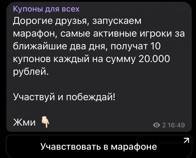 Марафон. Пост о марафоне так же можете посмотреть в канале пример: t.me/kyponi