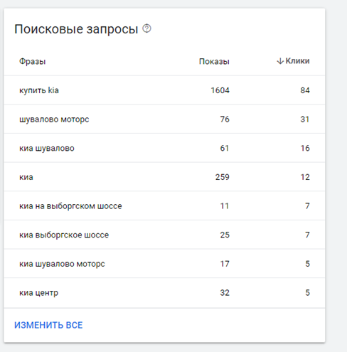 Ключи подбирались в разных вариациях, чтобы охватить все, что вбивает потенциальный клиент в поиске: точечные с названием дилера и его улицы, с упоминанием бренда KIA и словами «покупка», «сервис», популярные модели KIA и рекомендованные Google ключи — часто он предлагал полезные.
