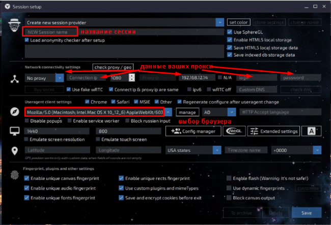 Заполняем название сессии, выбираем ОС, браузер, редактируем настройки прокси и наша сессия готова.