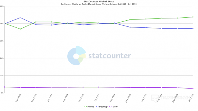Мобайл — 52,48%. Десктоп — 44,59%. Планшеты — 2,93%