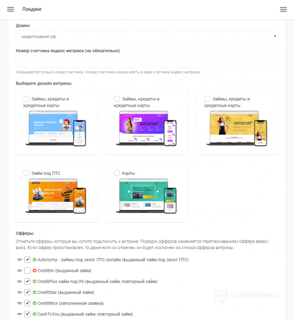 После выбора домена и дизайна вашего будущего лендинга вы выбираете офферы партнерки, отмечаете необходимые галочкой, меняете их местами как вам угодно. Все остальное партнерка сделала за вас — партнерские ссылки сгенерированы, ссылка на лендинг создана автоматически в момент сохранения. Вам остается только начать лить трафик.
