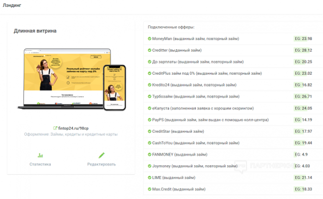 Что такое «витрина»? Это лендинг, предоставляющий на выбор несколько тематических предложений с партнерскими ссылками. Любой его выбор в перспективе принесет тебе деньги, только вот тратить драгоценное время на выбор домена и разработку сайта не нужно. Офферы уже все оттестированы партнеркой, но по желанию ты можешь отключать и подключать необходимые тебе, размещать их на лендинге в порядке доходности, следить за показателями.