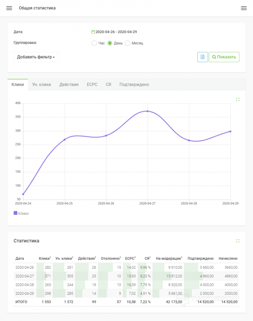 В кабинете вебмастера удобная и довольно подробная статистика, позволяющая анализировать переходы каждого оффера. Также вы можете использовать подробную статистику и анализировать более предметно все параметры вашего умного лендинга: